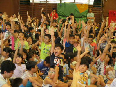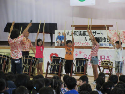 その後、体験コーナーが始まると、太鼓打ちを志願する子どもたちの声が丸い体育館に響き渡りました。