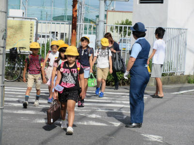交通指導員さんや保護者・地域の皆様に見守られて横断歩道を渡ります。