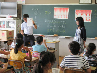 カラーテスターを口に含んで、磨き残しを確認しました。予想以上に磨き残しが多く、驚いた児童が多かったようです。