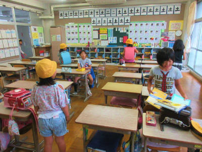 登校して教室に入った後、ランドセルから教科書やノートを出して机の中に入れます。