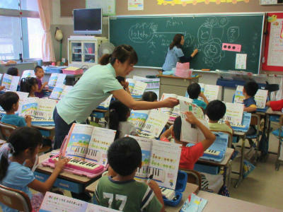 武里小では、1年生から担任の先生とともに音楽の先生が授業をしてくれます。