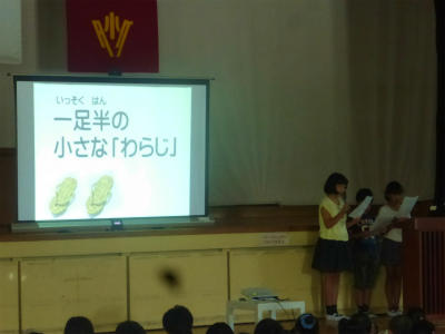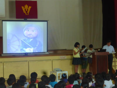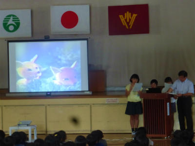 今日の全校朝会では、「おはなし玉手箱」の画像の一部を使いながら、校長先生と6年生の児童が、このお話を紹介してくれました。