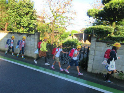 雨上がりの道路を、一列に並んで歩いて行きます。