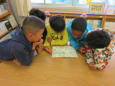 業間休み、図書室は大盛況でした。40名を超える児童が本を借りたり返したり。
