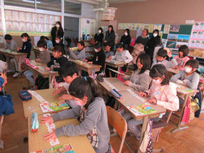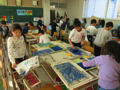 「羽子板のさか田」取締役の坂田さんをはじめ、4名のゲストティーチャーをお招きしました。さらに、オープン参観に来て下さった保護者の方の強力なサポートを得て、羽子板づくりがスタートしました。