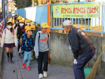 南門では、校務員さんが腰をかがめてあいさつをしてくださっています。