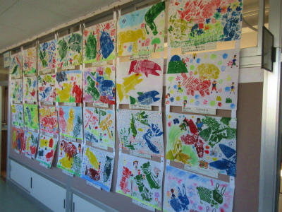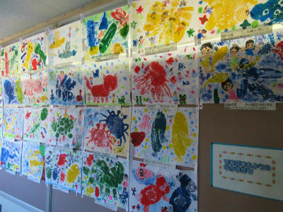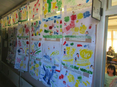 廊下側の壁面に、版画の作品を展示しています。本日の授業参観のときに、ゆっくりと御覧ください。