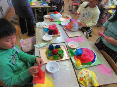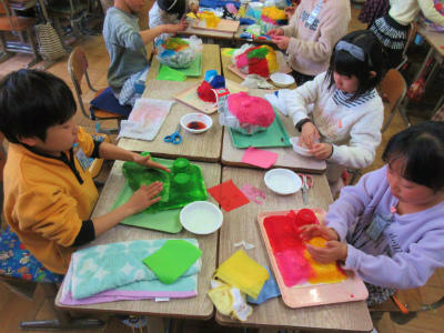 お面作りをしています。水にぬらしたお花紙を重ねていくと、不思議な色合いを表現することができます。