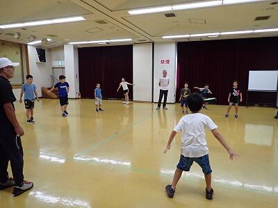暑さに注意しながら3・4年生の練習は体育館。各クラスごとに円になっています。