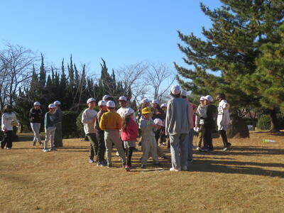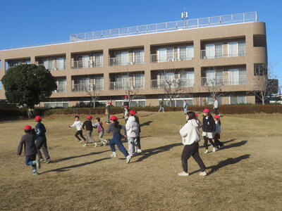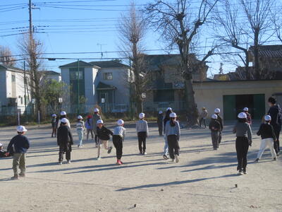 校庭で遊んだり、長縄をやっていた児童は、校庭の中央に集まり第一次動作をしていました。