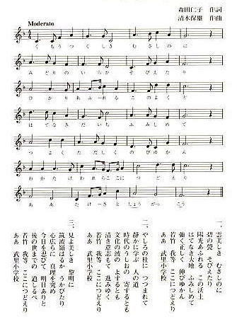 武里小学校の校歌は、昭和43年に作曲されました。作詞は森田仁子氏、作曲は清水保雄氏です。また、写真の校歌記念碑は、平成13年9月に寄贈され、現在も職員玄関となりに建てられています。