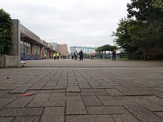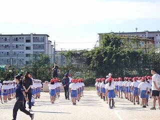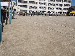 こども達は、校庭のそれぞれの地区の場所に集合し、担当の先生の話を聞きます。