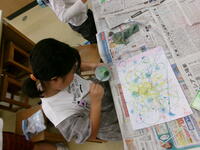 4年生が図工室で図工の学習を行いました。絵の具の様々な技法を練習していました。ビー玉、ストロー、カップ、スポンジ、ティッシュ、歯ブラシなど、色々な道具を使いながら絵を描いていました。今回学んだ技法を使ってどんな絵が描きあがるのでしょうか。楽しみです。
