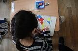 パレットに絵の具を出して、いろいろな容器や綿棒などを使って、画用紙にスタンプの要領で押しています。