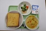 今日の献立は『フレンチトースト、牛乳、冬野菜のアーリオ・オーリオ、かぼちゃのシチュー』です。