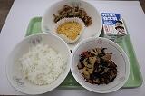 今日の給食のメニューは、『ごはん、牛乳、豚肉のオイスターソース焼き、切干大根の和え物、筑前煮』です。