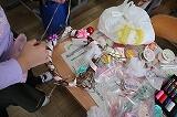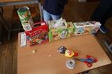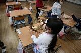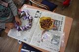 1年生は、育てたアサガオの弦を使ってリースを作りました。家から持ってきたいろいろな材料を、ボンドを使って上手に付けていました。家で飾ると素敵ですね。