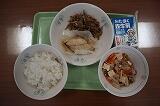 今日の給食のメニューは、『ごはん、牛乳、豚肉のオイスターソース焼き、切干大根の和え物、筑前煮』です。