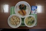 今日の給食の献立は、か『大山おこわ、牛乳、さわらのあけぼの天ぷら、磯かあえ、みそしる』です。 今日の給食は、食育の日の献立として、鳥取県の郷土料理の日です。大山おこわは、鳥取県にある大山という山がある地方の郷土料理です。地元でつくったもち米や野菜、鶏肉、山菜やキノコなどを使ったごはんです。
