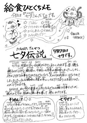 今日7月7日は七夕です。今日の給食の献立は、『七夕こんだて(ごはん・牛乳・ソフトカレイの竜田揚げ・辛し和え・そうめん汁・七夕ゼリー)』です。