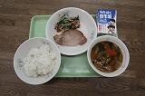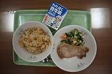 今日の献立は、『キムチチャーハン・牛乳・豚肉のオイスターソース焼き・大豆入りサラダ』です。