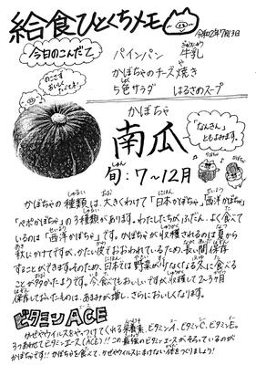 今日の主催のかぼちゃのチーズ焼きです。かぼちゃは、『南瓜』と書き、「なんきん」とも読みます。かぼちゃは今が旬の野菜で、ビタミンACEがそろった食品です。かぼちゃを食べて、かぜやウイルスに負けないからだをつくりましょう。今日もおいしい給食ありがとうございます。
