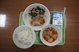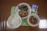 今日の献立は、『ごはん・牛乳・ぶた肉のしょうが焼き・とりじゃが・もやしと小松菜の塩こんぶあえ』です。