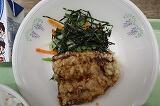 今日は「食育の日」の献立で、『クファジューシー・牛乳・白身魚のレモンソースかけ・マーミナーチャンプルー・パインゼリー』の沖縄県の郷土料理です。