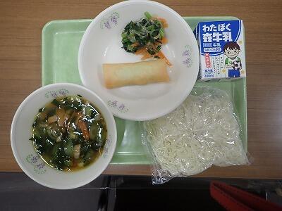 今日の献立は、ラーメン、アスパラのつつみ揚げ、春雨サラダ、牛乳です。