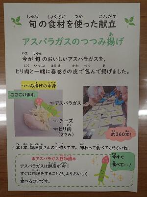 アスパラのつつみ揚げは、1本1本調理員さんが春巻きの皮につつんで揚げています。
