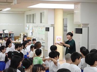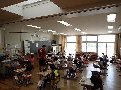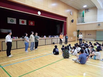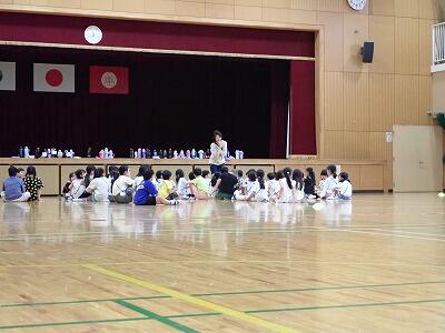 計画では、校庭でリレーの実演とともに行う予定でしたが、残念ながら雨のため体育館で行いました。