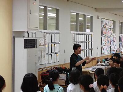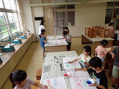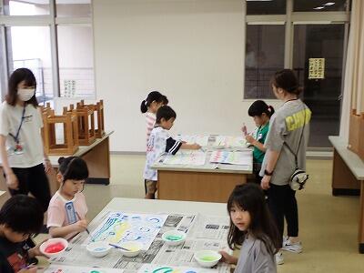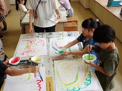 図工室では1の2が図工「すいすいぐるーり」を題材に、初めての絵の具に挑戦です。