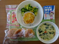 「スパゲッティ、牛乳、ミートソース、揚げ大豆サラダ、いちご蒸しパン」