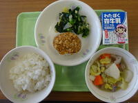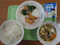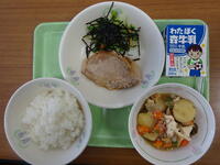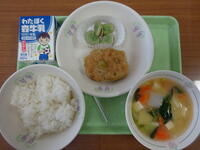 豆を中心としたとても健康的な給食でした。ハンバーグはおからやひじき、チーズなどが入り、大根おろしがかかり、とても柔らかく甘いハンバーグでした。けんちん汁も味噌が甘く野菜を美味しく包んでいてご飯ととても良く合いました。