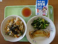 「いり飯、牛乳、かつおのごま揚げ、ほうれん草のおひたし、そうめん汁」