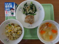 「中華風炊き込みご飯、牛乳、彩の国ねぎ塩まんじゅう、華風和え、春雨スープ」