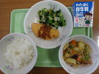 「ご飯、牛乳、ゼリーフライ、青菜とかんぴょうの和え物、凍り豆腐の煮物」