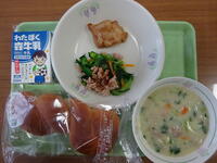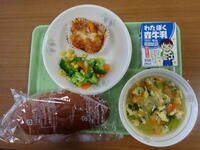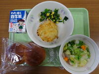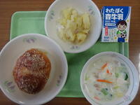 「焼きカレーパン、牛乳、ジャーマンポテト、キャベツの豆乳スープ」