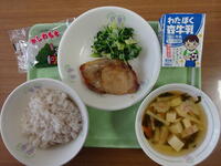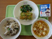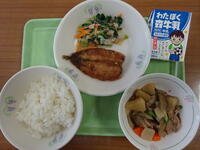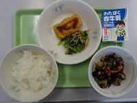 「ご飯、牛乳、アジの梅風味焼き、ごま酢和え、生揚げのそぼろ煮」