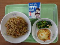「焼きそば、牛乳、さつま芋のタルト、ビーンズサラダ」