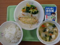 「グリンピース入りわかめご飯、牛乳、さわらのゆずこしょう焼き、おひたし、ごまみそ汁」