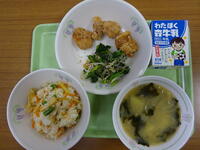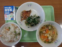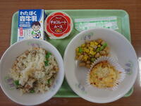 「たけのこご飯、牛乳、鶏肉のから揚げ、ごま酢和え、みそ汁」