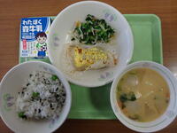 「五目飯、牛乳、竹輪の磯辺揚げ、小松菜とこんにゃくの酢味噌あえ、沢煮椀」