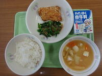 「ご飯、牛乳、さばの竜田揚げ、小松菜のごま和え、みそ汁」