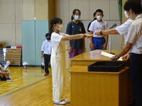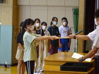 11日(月)に表彰朝会を行いました。今回は先日行われた硬筆と陸上競技大会の表彰です。硬筆では、市内硬筆展、県中央展覧会の表彰です。代表として2名の児童が登壇しました。市内陸上競技大会では、入賞した21名の表彰を行いました。硬筆展も陸上競技大会もどちらも大変立派な態度で臨むことができました。表彰されたみなさん、おめでとうございます。