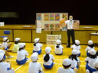7月1日(木) 春日部市教育委員会社会教育課の方々に来ていただいて、ジャンボ「かすかべ郷土かるた」大会を行いました。体育館で広がって、走らないなどのルールを守りながらとても楽しんでいました。