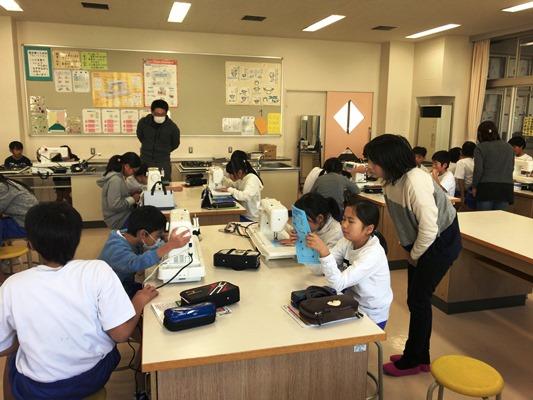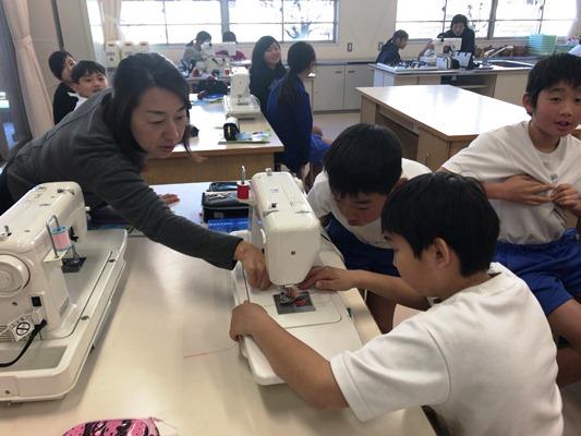 5年生の家庭科で、ミシンの使い方を学んでいます。いつも学校応援団の保護者の方々にお手伝いをいただいています。個別に教えていただけるので、いつも助かっています。ありがとうございます。