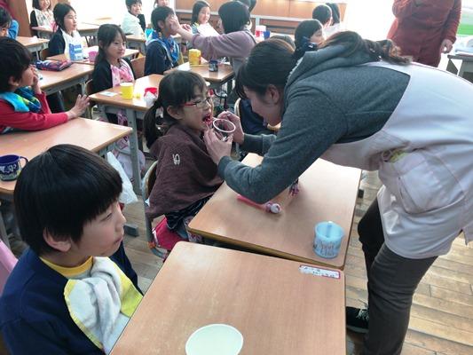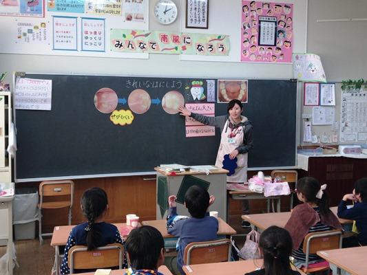 1年生の教室で、保健の「歯みがき指導」が行われていました。給食後の昼休みにも歯を磨いていますが、カラーテスターで調べてみると磨き残しに部分がよくわかります。養護教諭に歯に大切さや磨き方をていねいに教えてもらいました。一生付き合う歯ですから、大切に磨いてください。