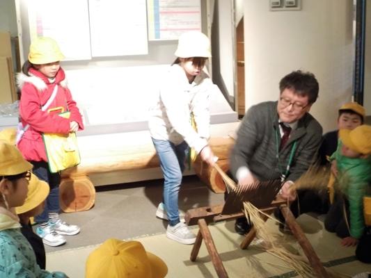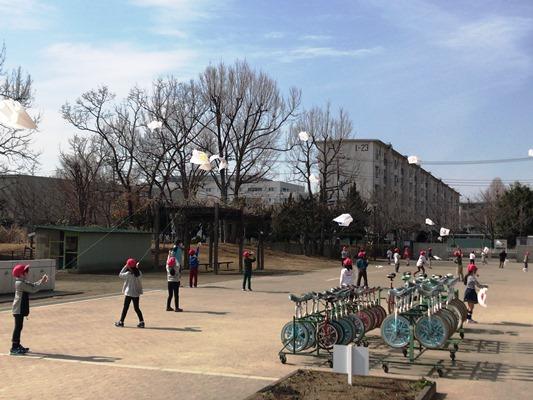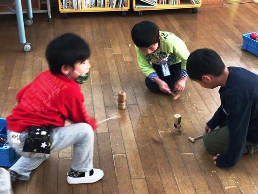 1年生のオープンスペースから、何やら楽しそうな声が聞こえてきました。近寄ってみるとみんなで昔遊びをしていました。やりはじめの時から比べてみるとみんな上達しました。これならば、他の人にも教えられますね。