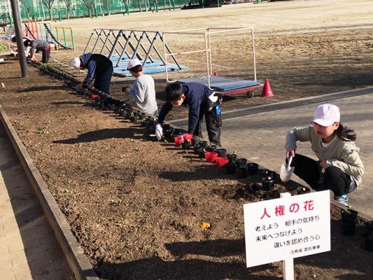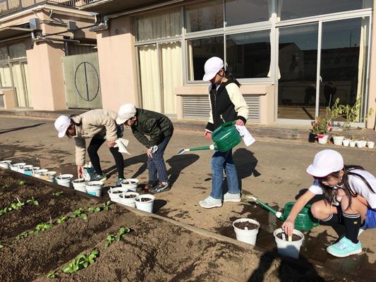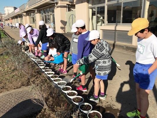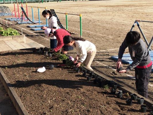 今日と明日は、栽培委員が種から育てたビオラの苗を鉢に植え替えます。丁寧に土を入れて苗を植えました。花が咲く春が待ち遠しいですね。